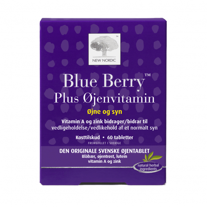 Blue Berry Plus øjenvitamin er en tablet med blåbær, der kombinerer ekstrakter fra øjentrøst og tagetesblomst samt vitamin A og zink. Tagetesekstraktet er fremstillet gennem en speciel proces for at sikre et standardiseret indhold