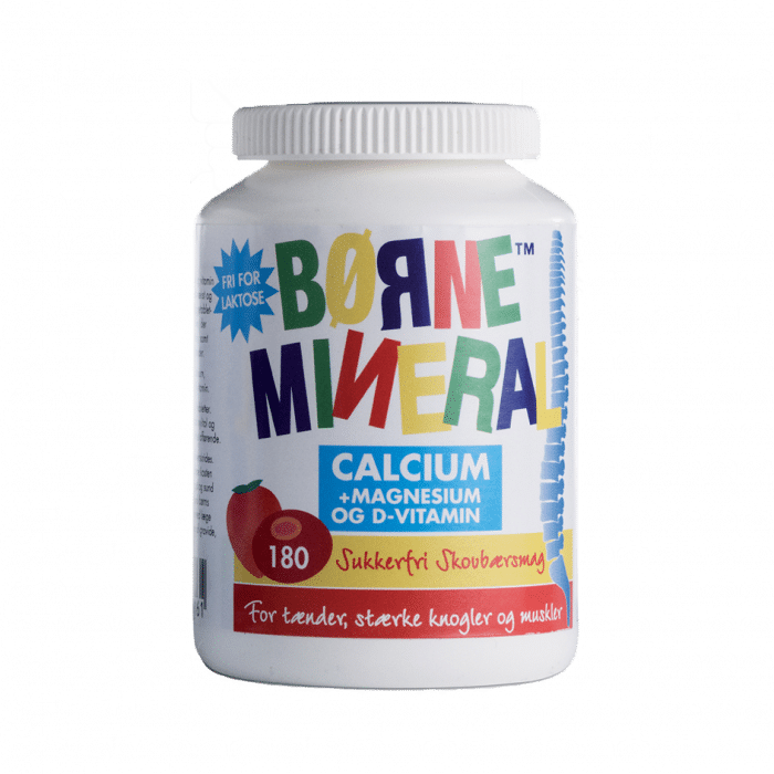 Børne Mineral indeholder kalk og D-vitamin, som bidrager til normal vækst og udvikling af knogler hos børn. Tyggetabletten indeholder desuden magnesium, der medvirker til normal muskelfunktion