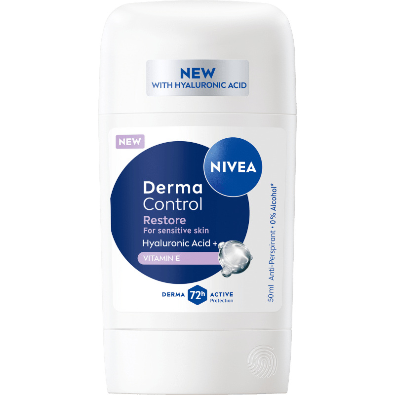 NIVEA Derma Control Restore-serien med ren hyaluron og E-vitamin beroliger irriteret hud efter barbering. Antiperspiranterne giver 72 timers sved- og lugtbeskyttelse, mens de efterlader dine armhuler blødere og smukkere med en sund hudfølelse. Til følsom