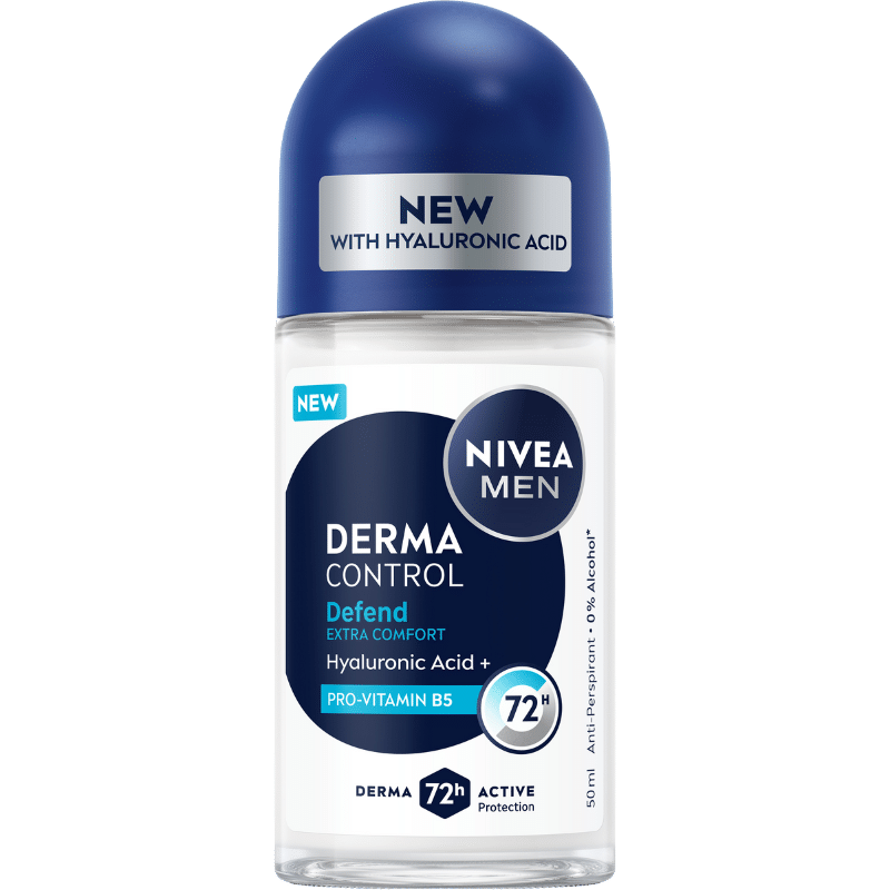 NIVEA Derma Control Defend Male Roll-on 50mlNIVEA MEN Defend Derma Control Anti-Perspirant giver beskyttelse mod lugt, sved, svie, kløe og tør hud. Med ren hyaluron og Pro-Vitamin B5 forebygger den kløe og giver skånsom pleje. Formlerne er hudtolerante, d