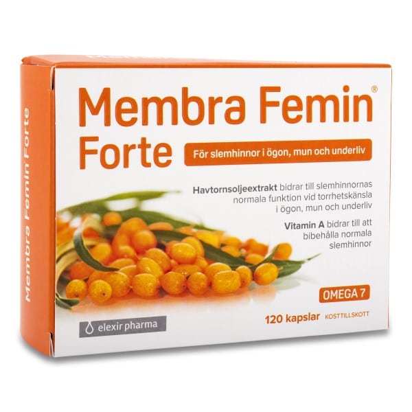 Elexir Pharma Membra Femin Forte er perfekt for dig, der oplever tørhed i mund, øjne og underliv. Membra Femin Forte indeholder omega-7 fra økologiske havtornbær samt A-vitamin, der bidrager til normalt syn, hud og slimhinder.