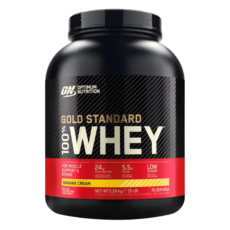 Støt dine træningsmål med Optimum Nutritions Gold Standard 100% Whey. Dette højkvalitets proteinpulver bidrager til at øge og vedligeholde muskelmasse, hvilket gør det ideelt efter træning. Nyd den lækre og cremede smag af banan.