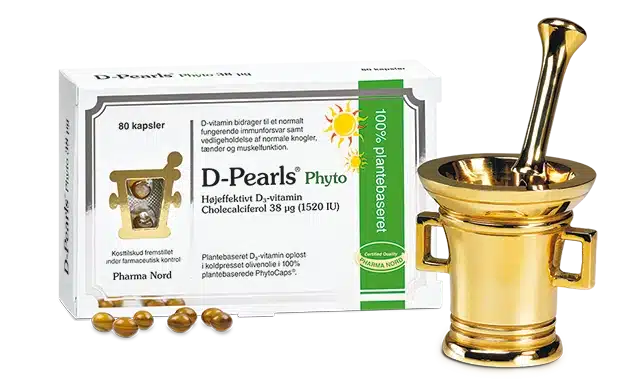 100% plantebaseret D3 vitamin i PhytocapsD-Pearls Green 38 µgVeganskVegetariskSmå perler med 38 µg D3-vitamin fra algerPhytocaps er lavet af fermenteret majs, kartoffel og ærter.