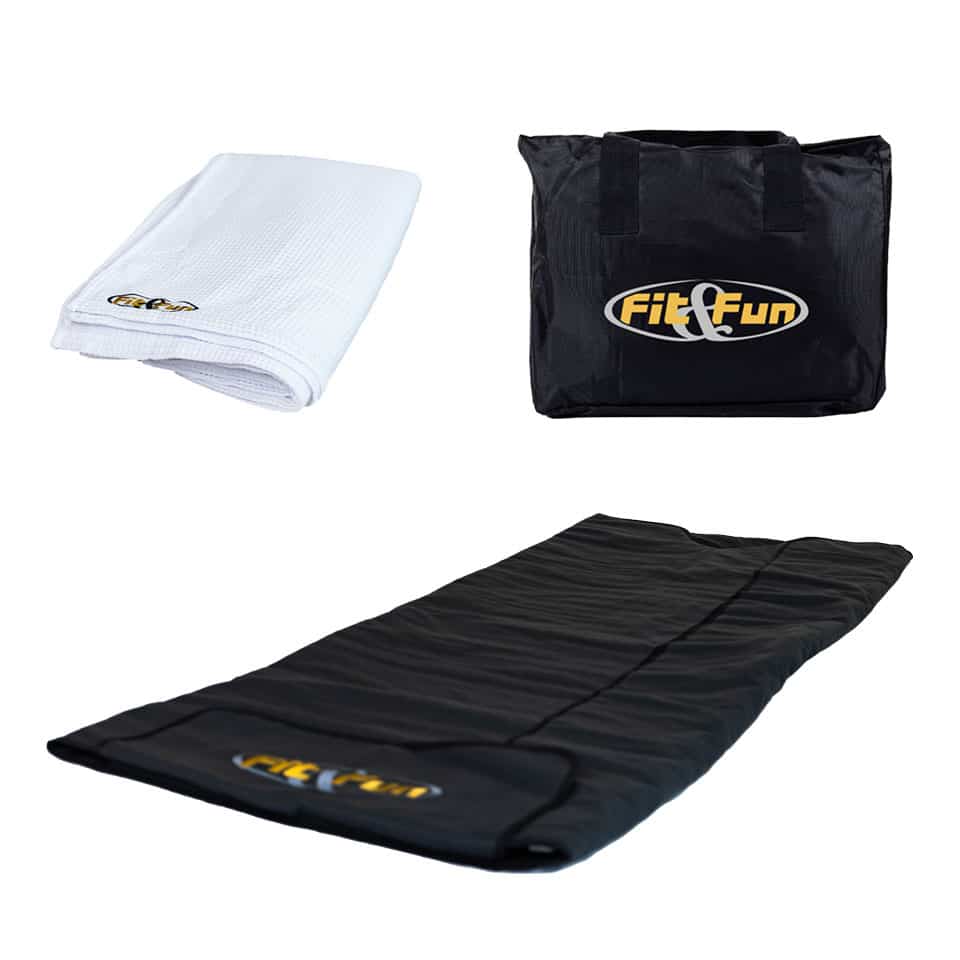 Forkæl dig selv med vores eksklusive Premium Infrarød Saunatæppe Pakke, der indeholder alt, hvad du har brug for til den ultimative saunaoplevelse. Dette luksuriøse sæt inkluderer vores Luksus infrarøde saunatæppe, der giver dig en skræddersyet varmeoplevelse med 3 justerbare varmezoner. Med i pakken finder du også et blødt håndklæde og en stilfuld taske, der gør din saunatid endnu mere praktisk og komfortabel.