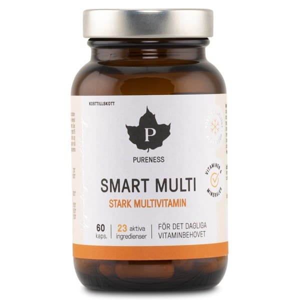 Pureness Smart Multi er et højtdoseret multivitamintilskud udviklet til at sikre, at du kan opfylde det daglige vitaminbehov. Hver kapsel indeholder 23 aktive ingredienser, såsom vitamin C, D og E, samt mineraler som jod, zink, mangan og molybdæn. Pureness Smart Multi inkluderer også alle 8 B-vitaminer i én og samme kapsel. Udover vitaminer og mineraler indeholder Pureness Smart Multi også stoffer som Q10, lutein og zeaxanthin. Pureness Smart Multi indeholder ikke jern eller selen, da disse kun bør anvendes ved mangel eller specifikke behov. Desuden kan jern forstyrre optagelsen af andre vitaminer. Kapslerne er fri for tilsætningsstoffer og fyldemidler.