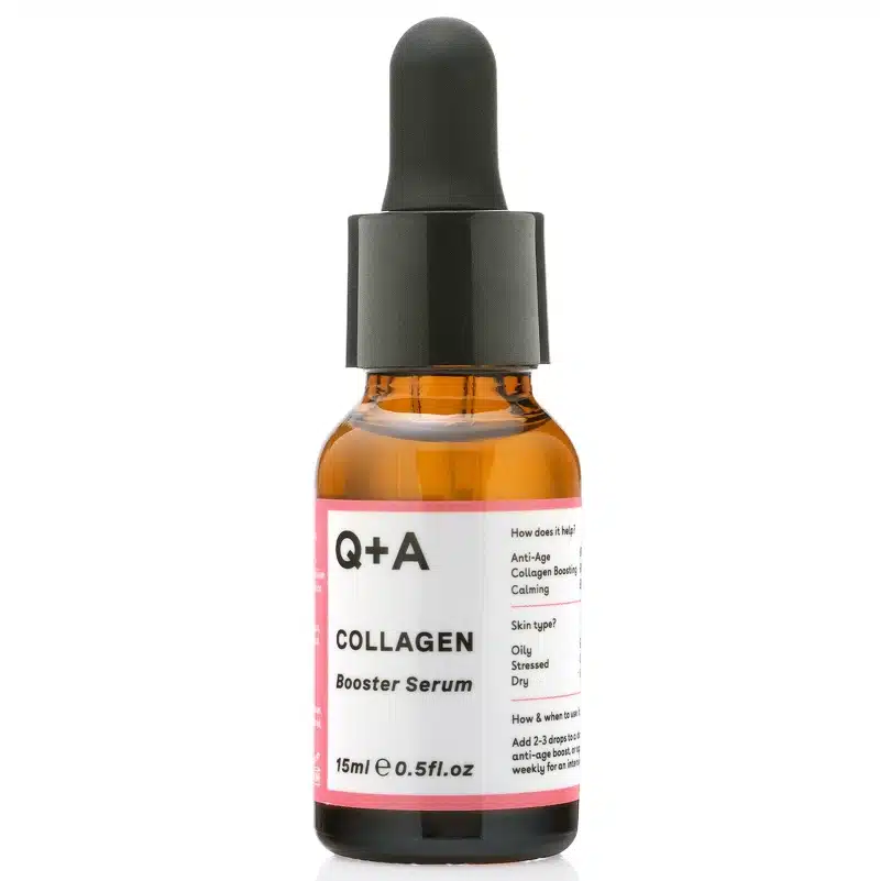 Q+A Collagen Booster Serum er et ansigtsserum med kollagen, der nærer og fugter huden. Et koncentreret serum formuleret med vegetabilsk afledt kollagen og algeekstrakter, der hjælper med at øge celleomsætningen og forbedre hudens smidighed og elasticitet.