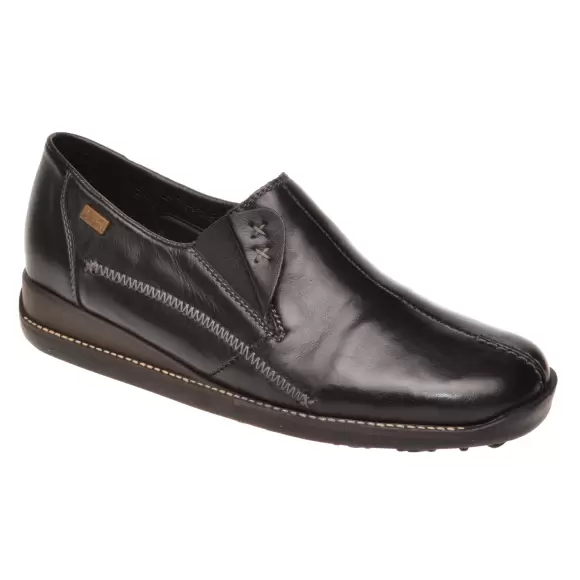 Art. nr.: 44253-00Pæn dame sko i skind fra Rieker. Skoen er lavet med to elastik kiler i hver side af overdelen så skoen er lige til at trække på. Sålen er lavet af fleksibelt gummi.