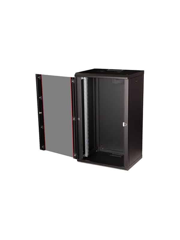 Rack kabinet, 600 x 450 mm (WxD), vægmonterbar, RAL 9005, jet black, 20U, 19″