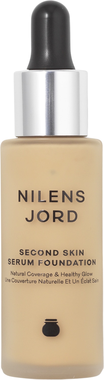 Second Skin Serum Foundation fra Nilens Jord er en unik vandbaseret og oliefri foundation med plejende serum af Vitamin A, C, E og Hyaluronsyre. Den ultra fine flydende tekstur trænger hurtigt ind i huden som efterlades ensartet og naturlig med et usminke