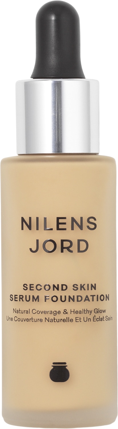 Second Skin Serum Foundation fra Nilens Jord er en unik vandbaseret og oliefri foundation med plejende serum af Vitamin A, C, E og Hyaluronsyre. Den ultra fine flydende tekstur trænger hurtigt ind i huden som efterlades ensartet og naturlig med et usminke