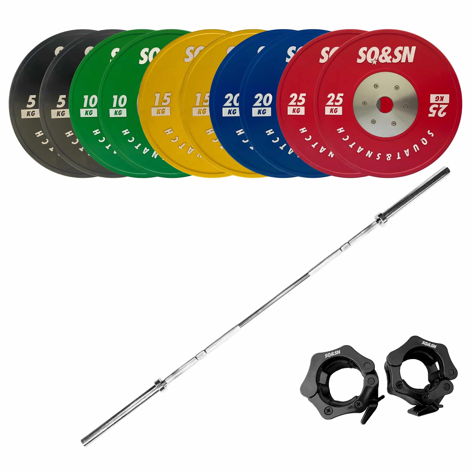 Komplet vægtstangssæt bestående af en SQ&SN OL Vægtstang (20 kg), et sæt SQ&SN Lock Jaw (50 mm) samt et sæt SQ&SN Competition Bumper Plates.