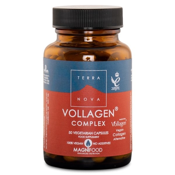 Terranova Vollagen Complex er et patenteret vegansk alternativ til kollagen, designet til at støtte produktionen af kollagen og fremme ungdommelig hud. Vollagen er fremstillet ved hjælp af en flertrinsfermentering og en mikroinkapslingsproces og består af aminosyrer i samme proportioner som det kollagen, der findes naturligt i kroppen. Aminosyrerne er allerede isolerede og optages derfor let af kroppen. Den unikke Terranova Vollagen Complex indeholder botaniske stoffer og hele fødevareforbindelser, der specifikt støtter hud-, hår-, negle- og led-sundhed. Komplekset hjælper med kollagenopbygning, ernæring og antioxidanter og har vist sig at være meget effektivt i undersøgelser, hvor man har set forskel på hudens fasthed, reducerede rynker, tørhed og pletter. Disse resultater blev opnået med en daglig dosis på 1000 mg, 2 kapsler om dagen. Vollagen® er 100% plantebaseret, hvilket gør det egnet til veganere og vegetarer.