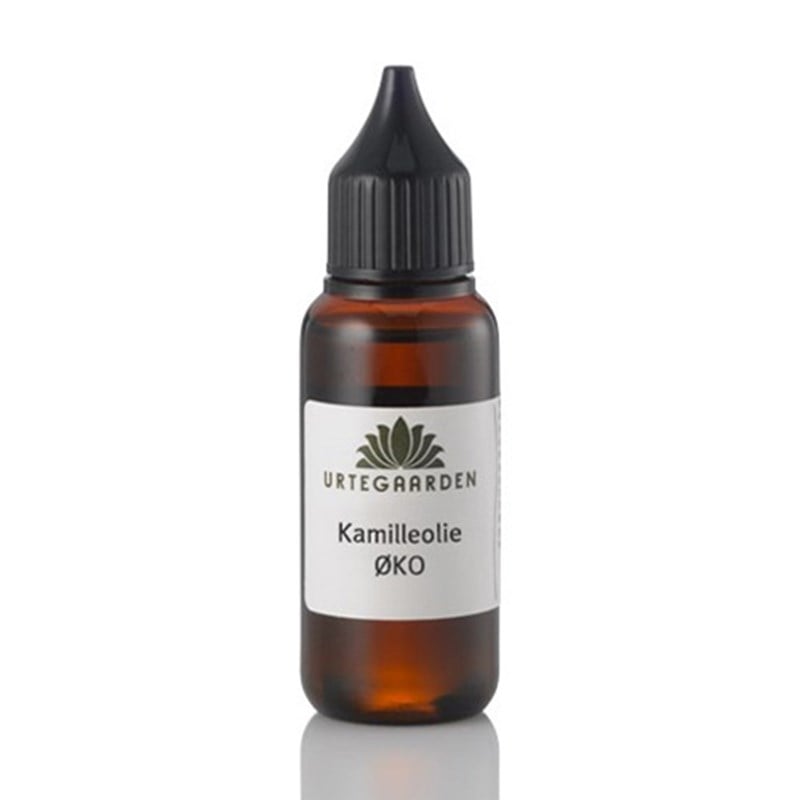 Økologisk kamilleblomst (Matricaria chamomilla) udtrukket i koldpresset økologisk solsikkeolie tilsat E-vitamin. Indeholder bl.a. betændelseshæmmende æteriske olier. Kamilleolie virker beroligende og lindrende på irriteret og sart hud. Kan anvendes til al