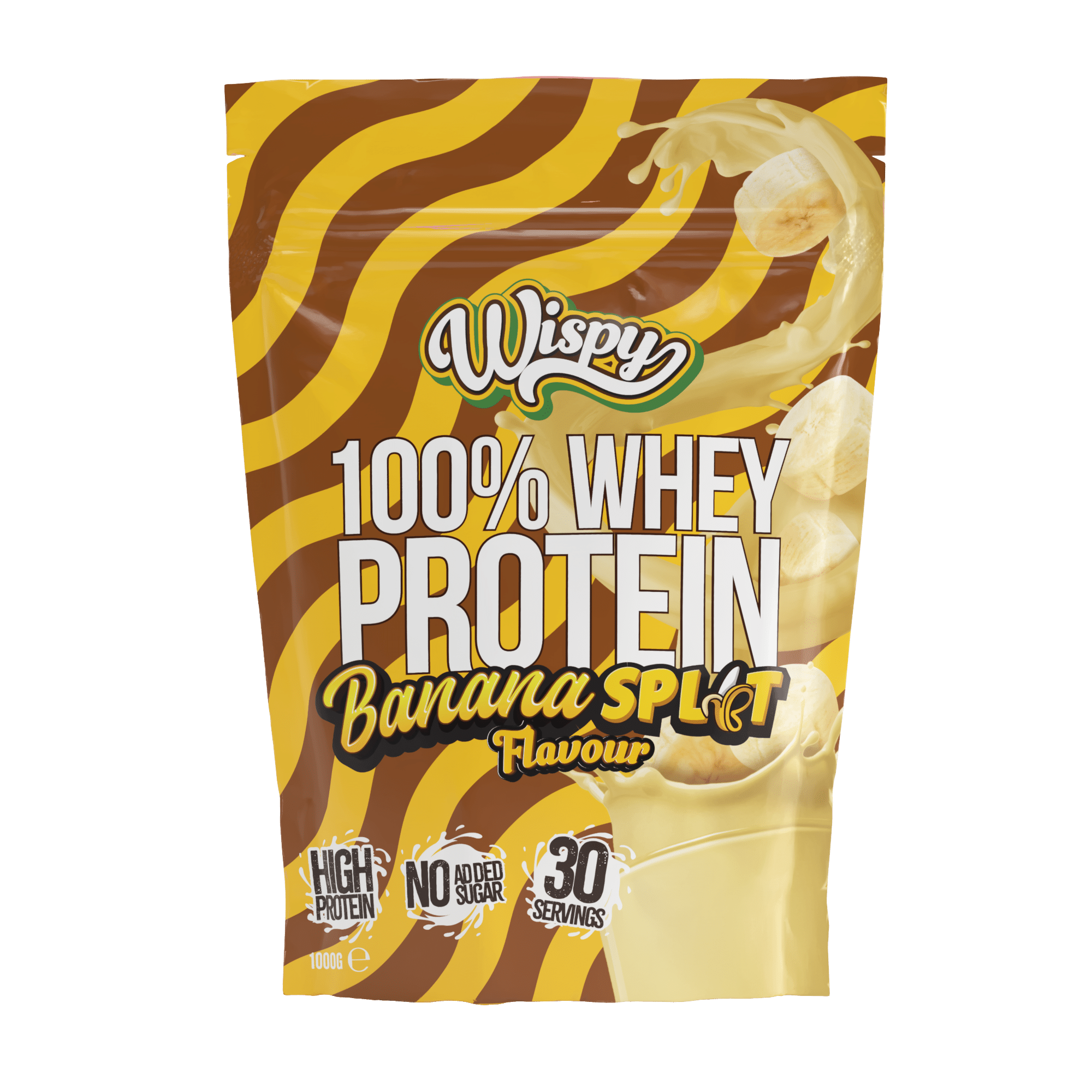 Wispy Whey 100 (1 kg) – Banana Split “Not your average banana. Not your average shake” B-A-N-A-N-A-S! Du kender sangen – men har du smagt den cremede og fyldige proteindrik, der smager som en dessert og performer som en shake? Split-te mine bramsejl! Den her smag sender dig direkte til en klassisk Banana Split: moden banan, let chokoladesødme og en rund, blød konsistens, der smelter på tungen – pakket ind i én drømmende, proteinrig mundfuld. 23 g protein pr. shake 126 kcal pr. shake Uden tilsat sukker Udviklet i Danmark Ét sip, og du er to steder på én gang – i gang med din træning og i gang med at nyde en overdådig servering på en eksklusiv restaurant. Wispy Whey Banana Split gør det muligt. Næringsindhold NÆRINGSINDHOLD: Banana Split Indhold pr. 100 g Energi 1588 kJ / 380 kcal Fedt 6,7 g – heraf mættede fedtsyrer 3,8 g Kulhydrater 8,9 g – heraf sukkerarter 5,1 g Kostfibre 2,6 g Protein 70 g Salt 1,1 g Ingredienser Valleprotein koncentrat fra mælk (indeholder emulgator (lecithin fra solsikke)). 4,3 % fedtreduceret kakaopulver, aroma, fortykningsmiddel (cellulosegummi), salt, sødestoffer (aspartam, acesulfamkalium). PRODUKTINFORMATION: Proteinpulver med smag af banan og chokolade. Indeholder sødestoffer og et naturligt indhold af sukker. Indeholder en phenylalaninkilde. BRUGSANVISNING: Kan bruges som supplement til en sund og varieret kost. Bland 1 skefuld (33 g) 1–4 gange dagligt i en shaker med 250 ml vand eller mælk. OPBEVARING: Opbevares i tillukket pose, tørt og ved stuetemperatur. NETTOVÆGT: 1000 gram.